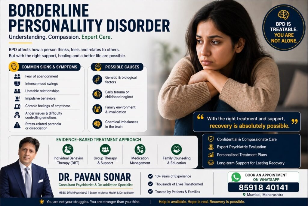 Diagnosis requires a thorough clinical evaluation by a mental health professional. Dr. Pavan Sonar, recognized for providing the Best Personality Disorder Treatment in Mumbai, conducts detailed interviews and psychological assessments to differentiate BPD from other conditions like Bipolar Disorder or ADHD. A proper diagnosis is the foundation of an effective recovery plan.